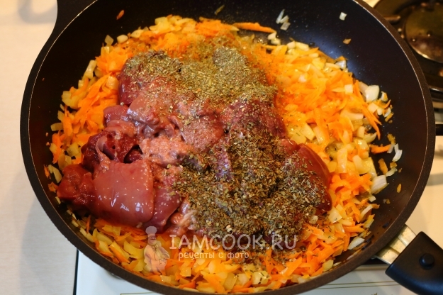 После чего выкладываем промытую и нарезанную куриную печень. Всыпаем соль, базилик и майоран по вкусу.