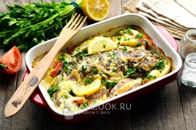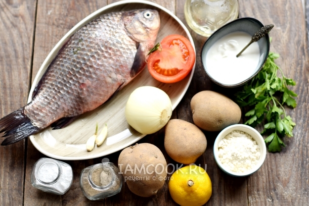 Карась, запеченный в сметане совместно картофелем и другими овощами — полноценное блюдо для сытного обеда, не требующие никаких дополнительных продуктов. В одной емкости сразу запекается рыба и гарнир к ней — это очень удобно. Поскольку на запекание картофеля уходит больше времени, чем на приготовление рыбы, клубни картофеля отвариваются заранее, а во время запекания они лишь впитывают в себя сметанный соус, а также вкус и запах сопутствующих ингредиентов. Блюдо очень вкусное, сочное и ароматное, при этом недорогое по себестоимости.