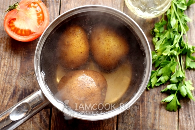 В первую очередь отварите картофель. Клубни варите в целом виде, не снимая кожицы. Картошка после варки обязательно должна оставаться целой, не разваренной, лучше пусть она будет в состоянии «аль денте».