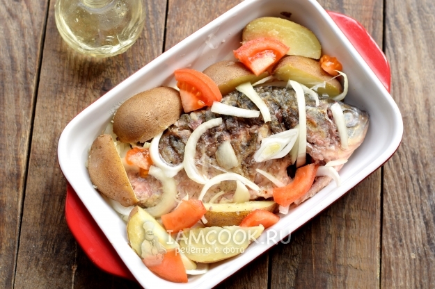 Форму для запекания слегка смажьте растительным маслом, на дно уложите рыбу. Картофель вместе с кожурой нарежьте крупными ломтиками, уложите по бокам карася. Помидор нарежьте дольками, репчатый лук — перьями, зубочки чеснока разрежьте пополам. Все подготовленные компоненты также поместите в форму.