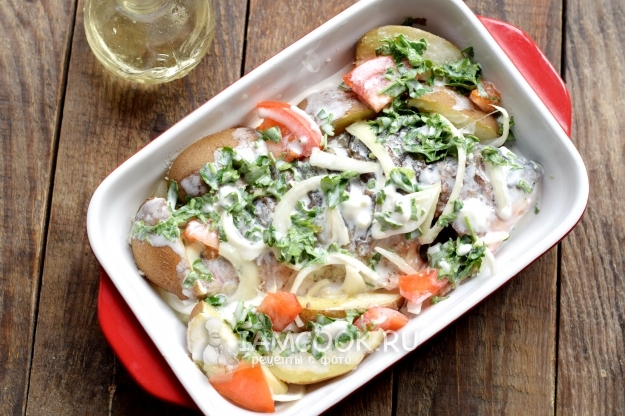 Содержимое емкости залейте сметанным соусом. Блюдо загрузите в нагретую до 200 градусов духовку, запекайте следующие 20 минут.