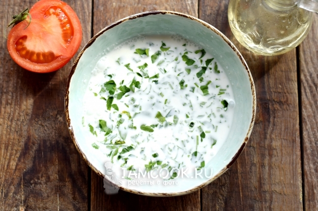 Сметану смешайте с водой, добавьте измельченные листочки петрушки, посолите, поперчите, затем тщательно перемешайте.
