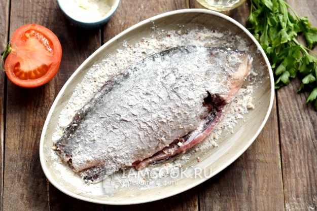 Муку смешайте с солью, данной смесью присыпьте рыбу со всех сторон.