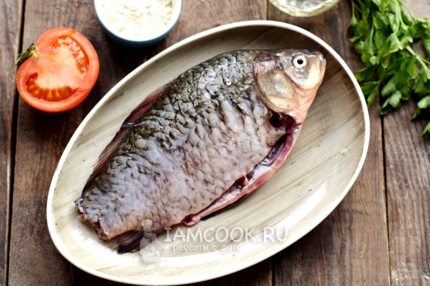 Подготовьте одну большую тушку карася или несколько меньшего размера. Рыбу очистите от шелухи, удалите внутренности и хвост. Если рыба вместе с хвостом помещается в емкость для жарки и запекания, то хвост можно не обрезать. Обязательно удалите жабры, голову оставьте. Тушку хорошо вымойте внутри и снаружи.