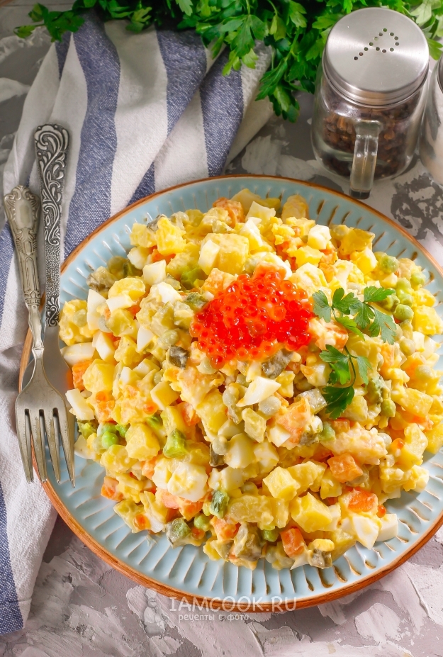 Салат «Оливье» с креветками и красной икрой готов. Выложите его на тарелку и подайте к столу, украсив сверху красной икрой.