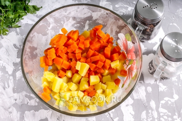 Очистите отварные картофель и морковь от кожуры, промойте и нарежьте средними кубиками. Высыпьте в глубокую емкость.