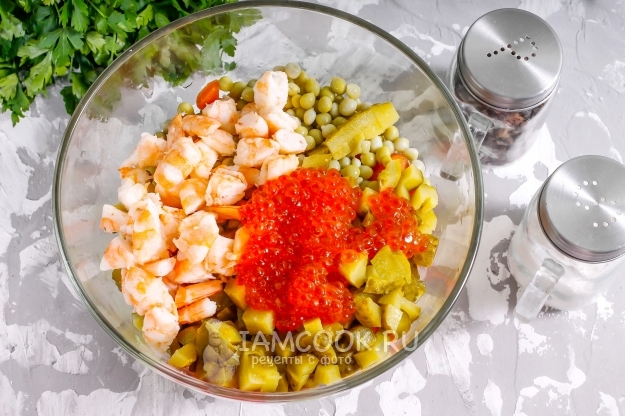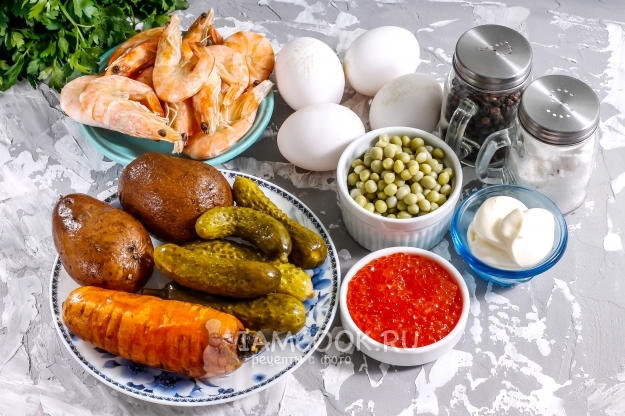 Сразу же хочу сказать, что блюдо солить не нужно - в нем присутствуют соленая красная икра, огурцы и консервированный горошек. Креветок я приобретала замороженными, поэтому указываю их вес в замороженном виде. Так как они продаются уже варено-морожеными, то их следует лишь прогреть в кипящей воде около 1-2 минут, а затем слегка остудить. Картофель и морковь рекомендую отварить заранее в течение 35-40 минут, а куриные яйца - в течение 12-15 минут и остудить все эти продукты в ледяной воде. Если вы добавите в салат нарезки горячих продуктов, то его срок годности сократится до 3-4 часов.