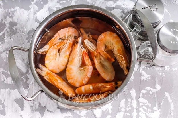 Креветок высыпьте в кипящую воду, протомите около 2 минут и извлеките, остудите и очистите от панцирей. Удалите из хвоста каждой креветки пищевод, промойте их.
