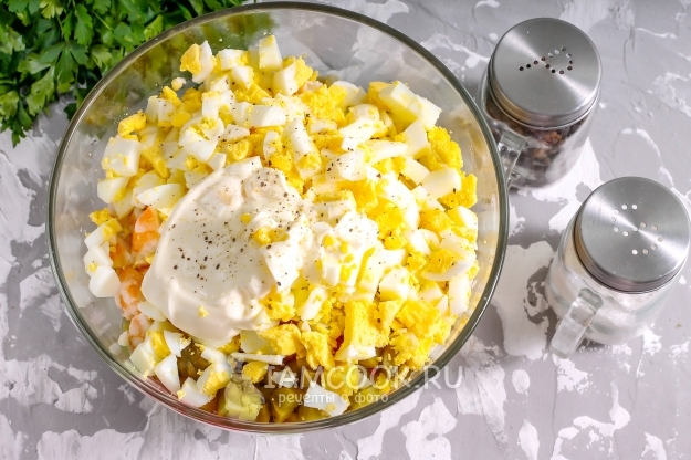 Очистите отварные куриные яйца от скорлупы, промойте в воде. Нарежьте таким же образом, как и картофель. Всыпьте в емкость, добавьте майонез и молотый черный перец. Аккуратно все перемешайте.