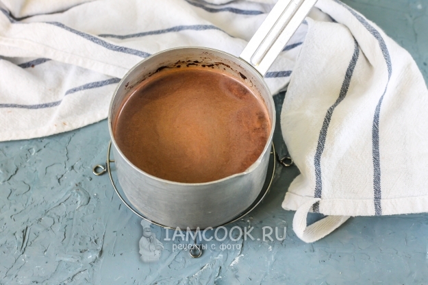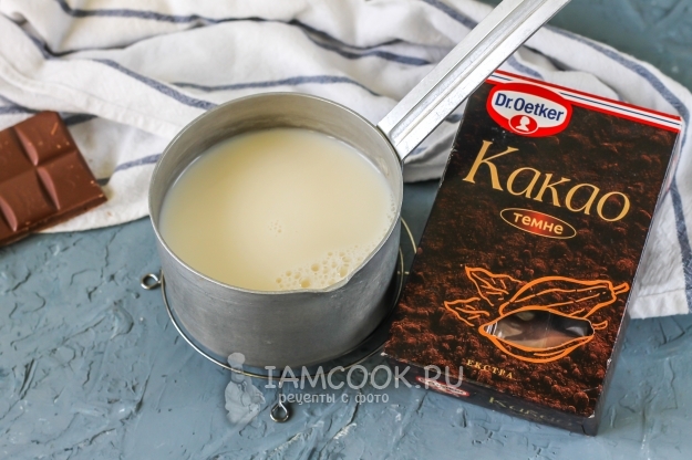 Всыпьте какао-порошок, поместите емкость на плиту и доведите до кипения, размешивая венчиком. Выключите нагрев.