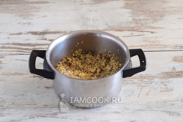 Начнем приготовление запеканки с того, что отварим киноа. В кастрюлю нальем 300 мл воды и поставим ее на огонь, дадим воде закипеть. Крупу промоем под проточной водой несколько раз. В кипящую воду добавляем 0,5 ч.л. соли и высыпаем крупу киноа. Дадим воде еще раз закипеть, убавим огонь до минимального и готовим крупу минут 10, пока не выкипит вода.