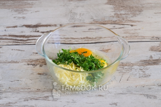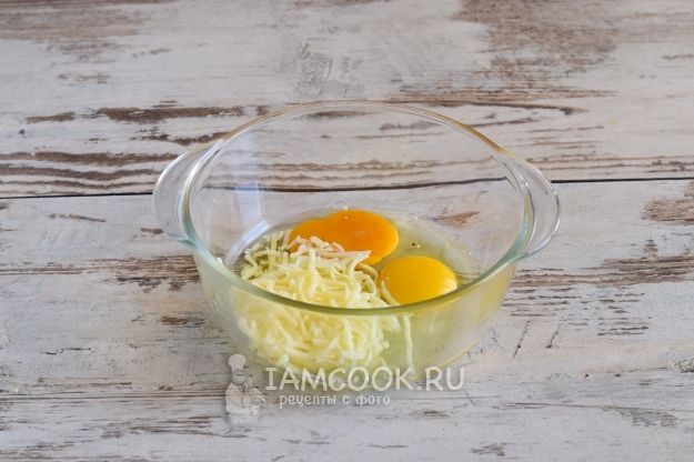 В миске смешаем два яйца, половину сыра, натертого на средней или крупной терке.
