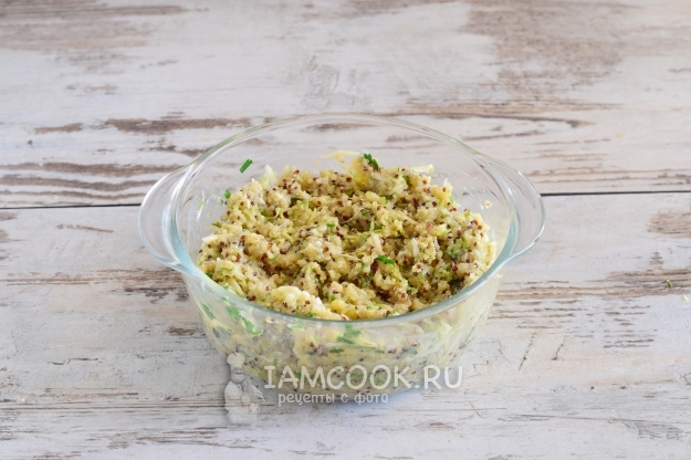 Добавим натертый кабачок в миску с яйцами. Если у вас очень сочный кабачок, слегка отожмите жидкость из натертого кабачка, но не сильно(!). Также добавим киноа и все хорошо перемешаем. Добавляем соль и перец черный молотый по вкусу.