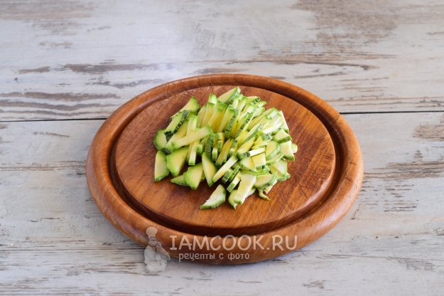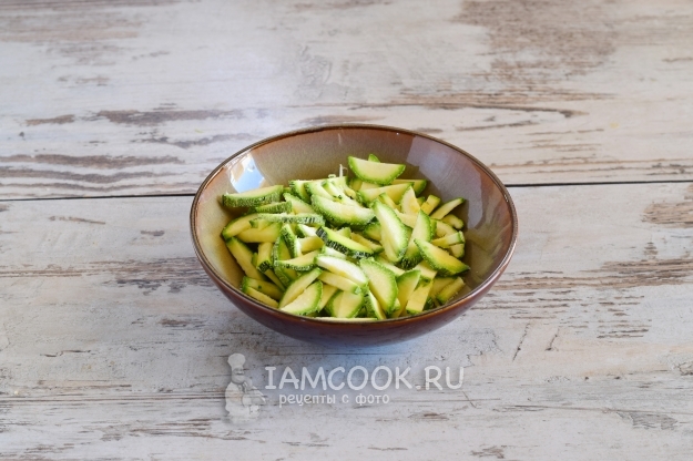 Второй кабачок нарезаем на кружочки, а потом кружочки разрезаем пополам.