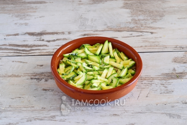 Выкладываем кусочки цуккини вторым слоем в форму для запекания.
