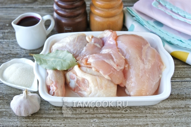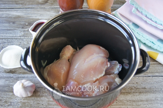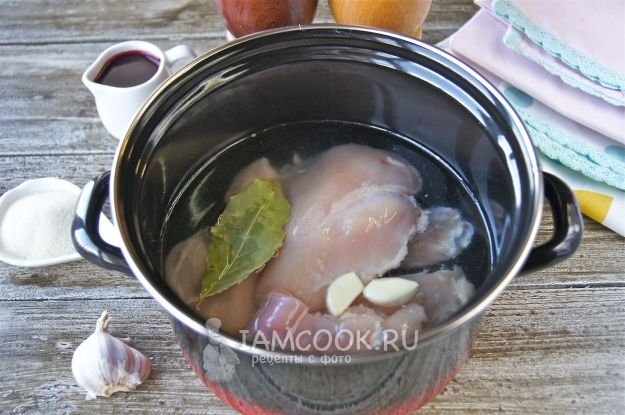 С курицы снимите кожу, поместите мясо в кастрюлю.