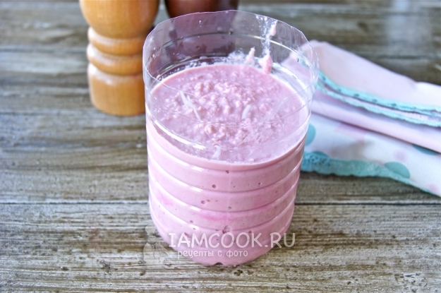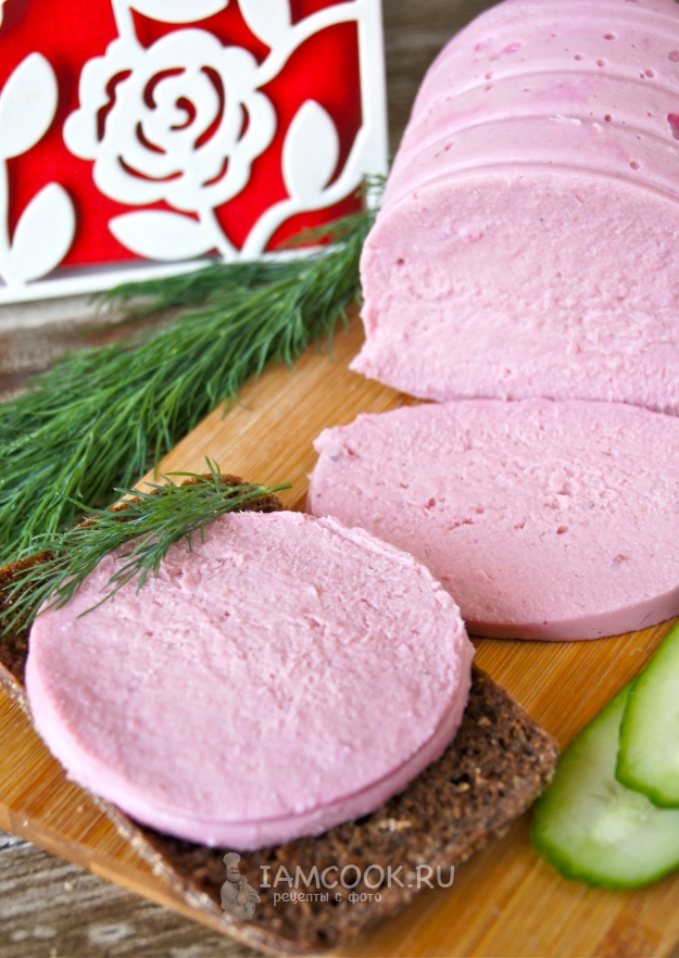 У пищевой пластиковой бутылки отрежьте верхушку, перелейте колбасную массу, затяните пищевой пленкой и поставьте в холодильник минимум на 3 часа.