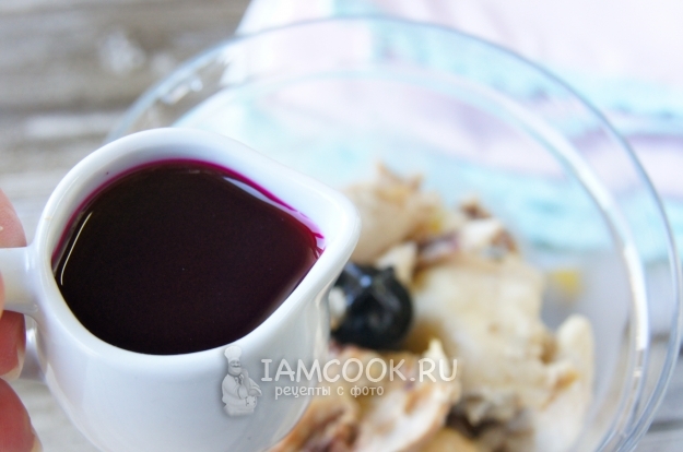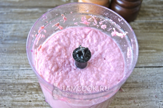 Куриное мясо поместите в чашу блендера, влейте свекольный сок, я его выжала из вареной свеклы.