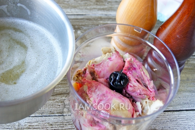 Процедите бульон (около 200 мл), всыпьте в него желатин, нагрейте до кипения, НО НЕ КИПЯТИТЕ!