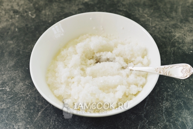 Выложите в белок соль, аккуратно перемешайте. Соли нужно брать из расчета 500 граммов на 1 куриный белок на каждые 500 граммов рыбы. У меня дорадо - как раз 500 г. Если куриный белок от мелкого яйца, тогда добавьте немного холодной воды, соль вся должна быть влажной.
