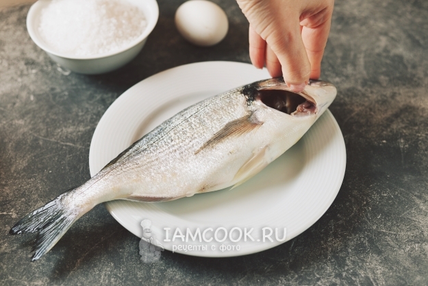 Рыбу помойте под проточной водой, удалите жабры, через их отверстие аккуратно достаньте все внутренности. Разрезать живот не стоит, чистить чешую тоже не нужно, она не дает проникнуть соли в рыбу. Можно в брюшко положить веточку розмарина, тимьяна, или ломтик лимона, но это по желанию, поскольку вкус готовой рыбы самодостаточный и не особо в этом нуждается.