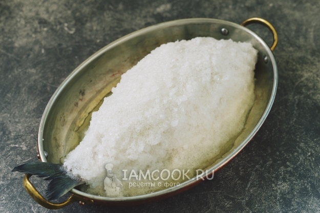 В форму для запекания выложите немного соли на дно, на нее положите рыбу.