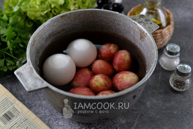 Картофель очистите, помойте вместе с яйцами, поставьте вариться. После закипания воды яйца варите 8 минут, картофель - около 15. Маленькие клубни молодого картофеля варятся очень быстро. Яйца остудите в холодной воде, очистите от скорлупы.
