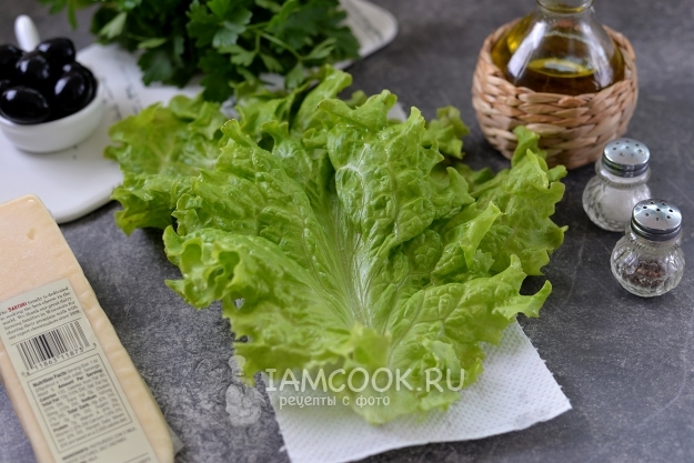 Листовой салат промойте под проточной водой, обсушите насухо бумажными полотенцами.