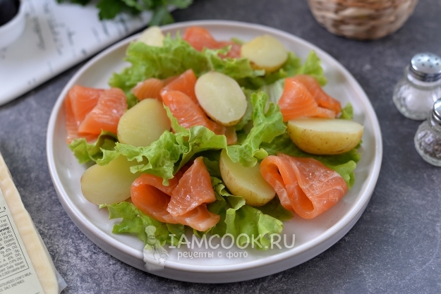 На дно блюда, на котором будете подавать салат, положите латук, порванный руками. На зелень положите остывший картофель, разрезанный пополам, и ломти тонко нарезанного лосося.