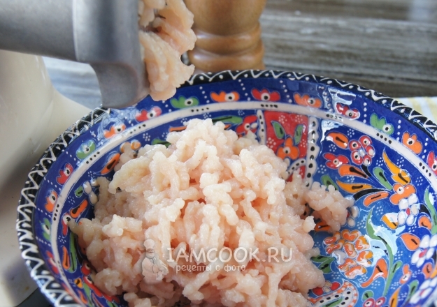 Пока капуста варится, нарежем грудку на средние куски и прокрутим через мясорубку.