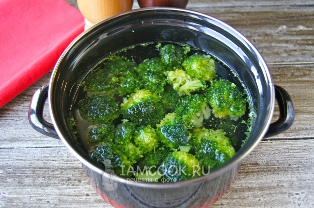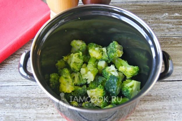 Для начала нарежем брокколи на небольшие соцветия и поместим в кастрюлю.