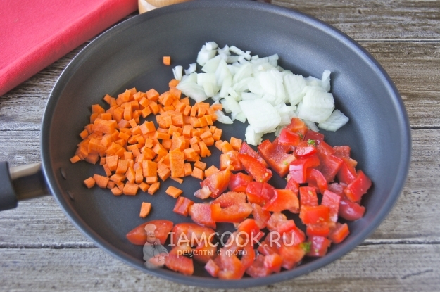 За это время нарежем мелко лук, морковь, перец и обжарим в минимальном количестве масла до мягкости.
