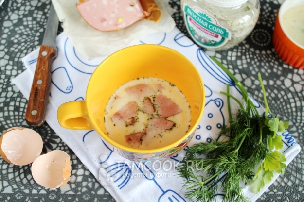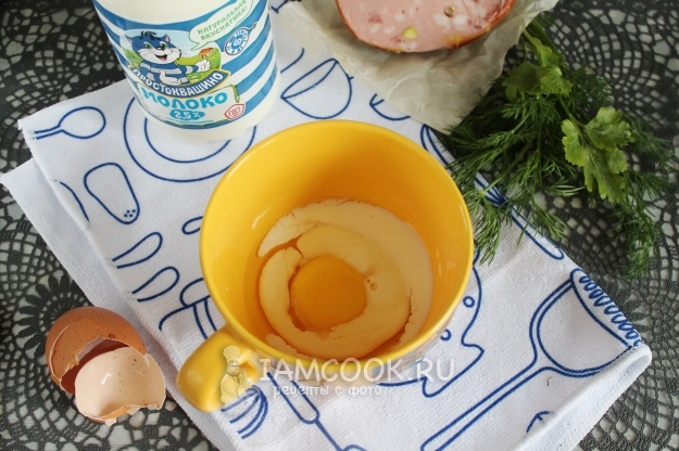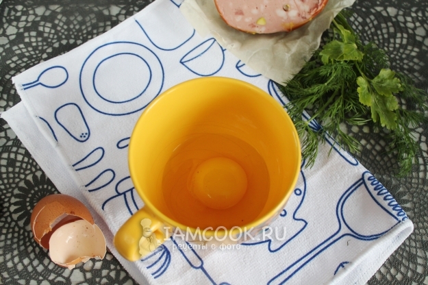 Готовить омлетную смесь будем нынче в той же чашке, в которой и готовить. Разбейте в керамическую суповую чашку куриное яйцо (если привыкли есть на завтрак омлет из двух яиц - удвойте порцию).