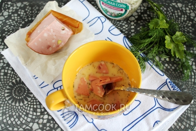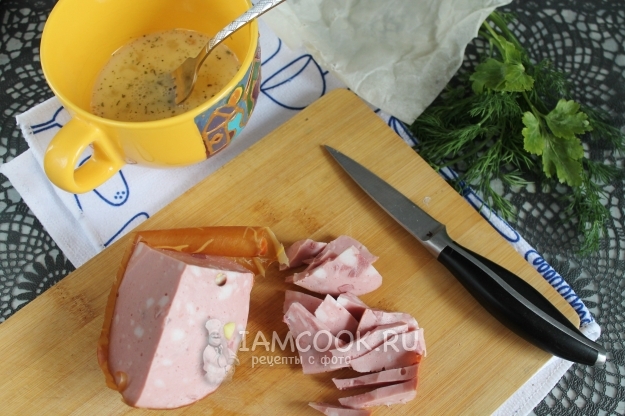 Опустите ломтики колбасы в омлетную массу и перемешайте.