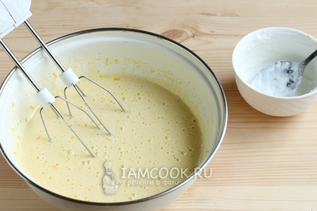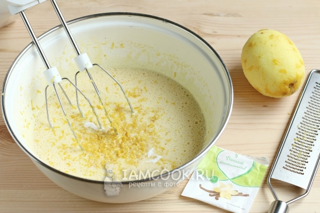 Яйца с желтками взбиваем миксером вместе с сахаром, добавляем лимонную цедру и ванилин.
