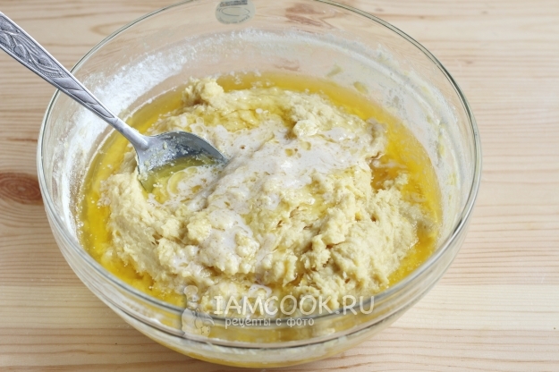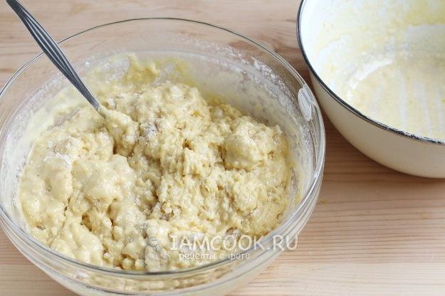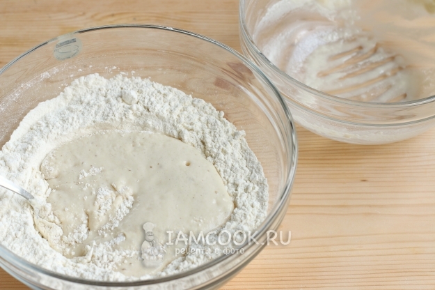 Взбитую массу добавляем в миску с мукой и опарой, начинаем все смешивать.