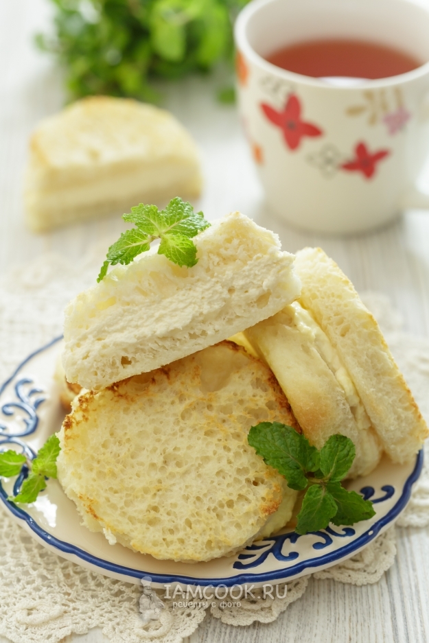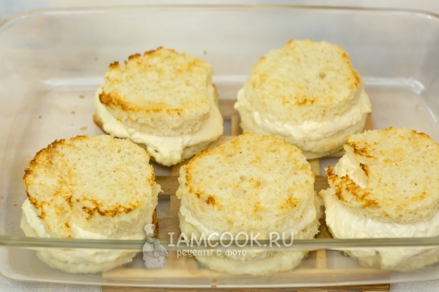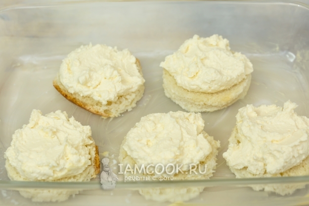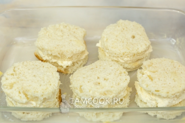 Оставшиеся кружочки так же окуните в молоко и накройте ими творог мокрой стороной вверх.