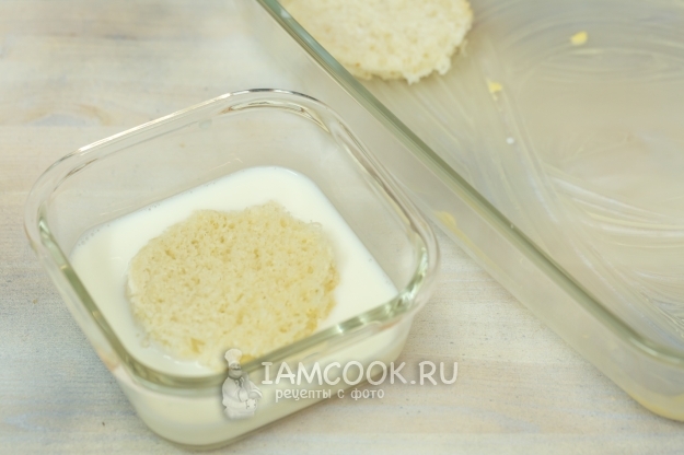 В молоко окунайте кружочки хлеба и выкладывайте мокрой стороной на противень.