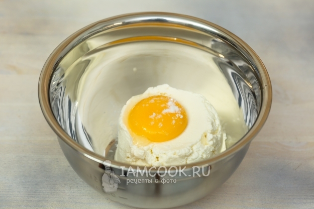 Творог смешайте с яичным желтком, ванилином и сахаром. Перемешайте.