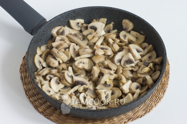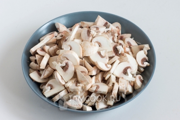Шампиньоны промойте, освежите срез ножки, удалите темные и подпорченные места. Подготовленные шампиньоны нарежьте пластинками.