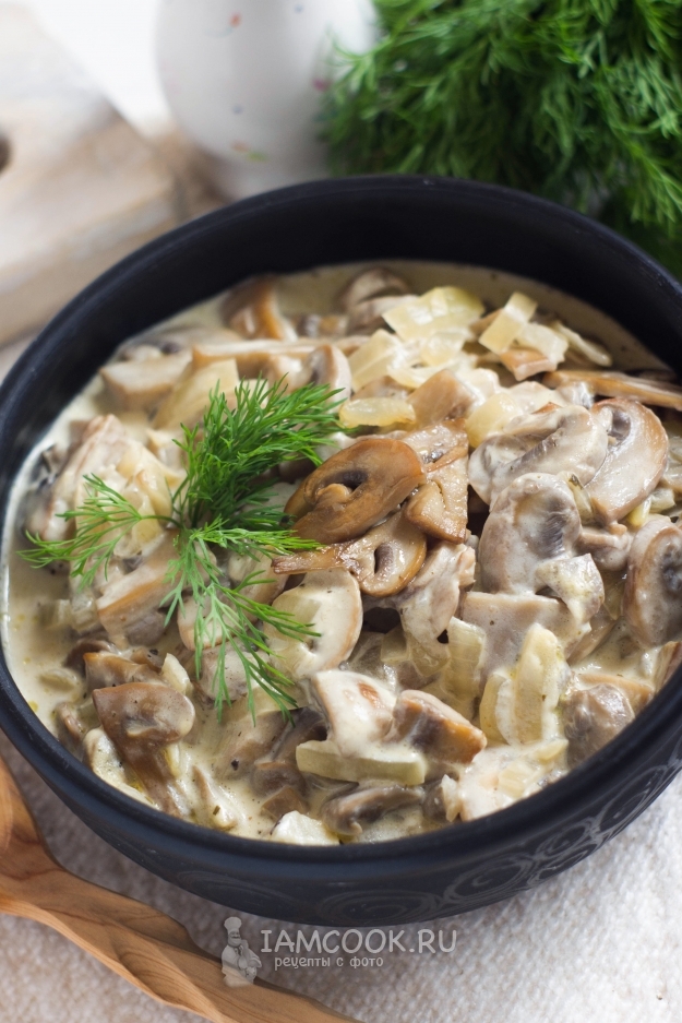 Жареные шампиньоны со сметаной готовы к подаче. Украсьте грибы свежей зеленью по желанию. Приятного аппетита!