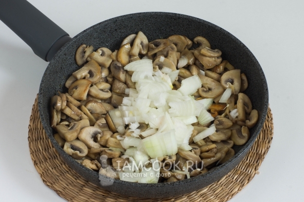 Когда сок испарится, слегка обжарьте грибы, чтобы они немного подрумянились. Добавьте очищенный лук, нарезанный кубиками.