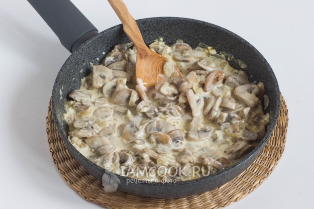 У меня сметана очень густая, поэтому я добавила еще немного воды, чтобы получилась не такая густая подлива. Доведите шампиньоны со сметаной до кипения, накройте крышкой, выключите огонь и дайте постоять 5-10 минут.