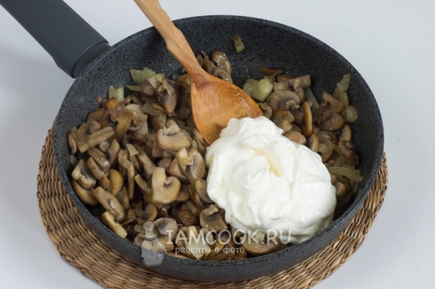 Обжаривайте все вместе 2-3 минуты. Затем добавьте сметану, соль и пряности. Перемешайте.
