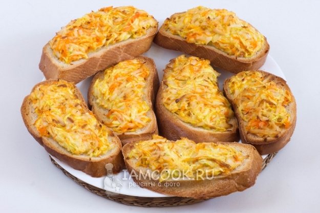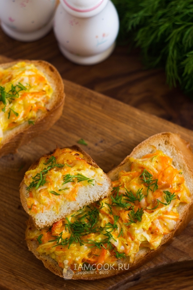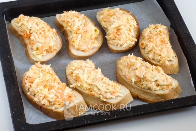 Полученную массу равномерно распределите на ломтиках батона. Выложите на противень.