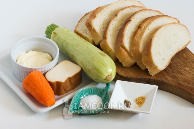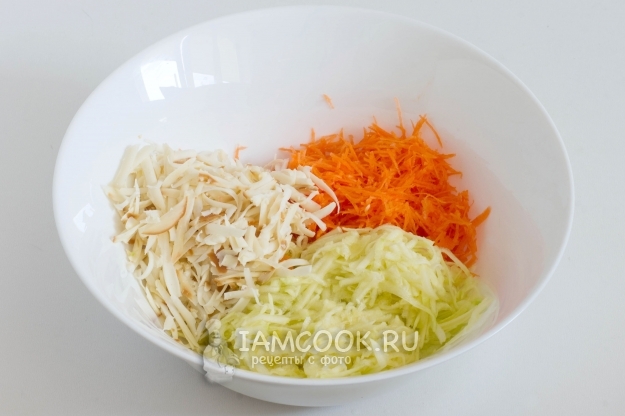 Кабачок промойте, срежьте кончики и шкурку. Натрите кабачок на крупной терке. Также на крупной нужно натереть колбасный сыр. Очищенную морковь натрите на мелкой терке. Соедините измельченные ингредиенты.