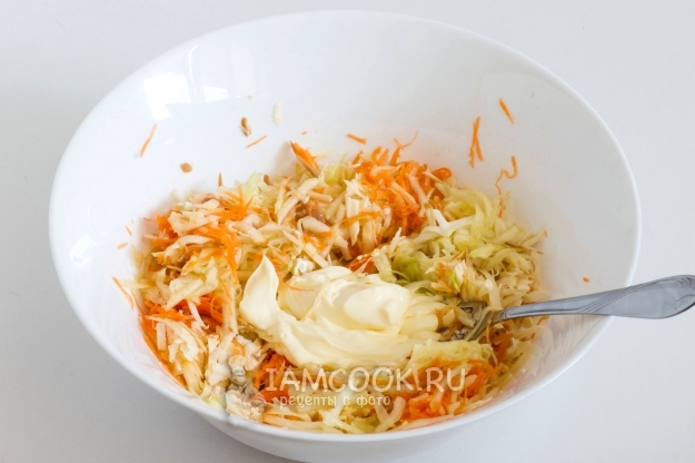 Перемешайте, добавьте соль, пряности и майонез. Еще раз перемешайте.