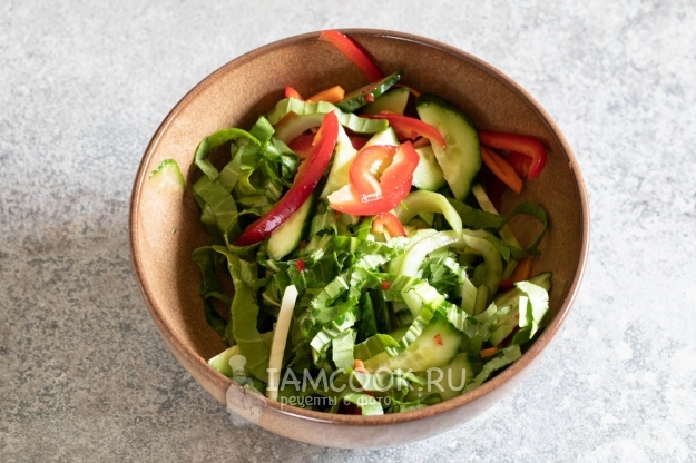 Ну, и хорошо смешиваем салат с пак чой, приправив его растительным маслом, солью и мелко рубленным жгучим перцем.