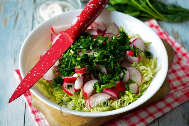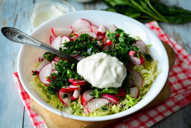 Приготовить салат из пекинской капусты и редиски совсем несложно, необходимо лишь ваше желание и небольшой набор продуктов. Кроме капусты и редиски, возьмите свежую зелень - укроп и петрушку. Они придадут салату аромат весенней свежести. Для заправки используйте сметану любой жирности: 10-25%. Сметану при желании можно всегда заменить на классический йогурт.