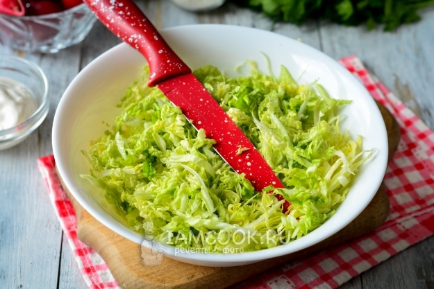 Редиску промыть и немного подсушить на салфетках от воды. Срезать с редиски хвостики, затем нарезать ее полукольцами. Добавить в салат к капусте.